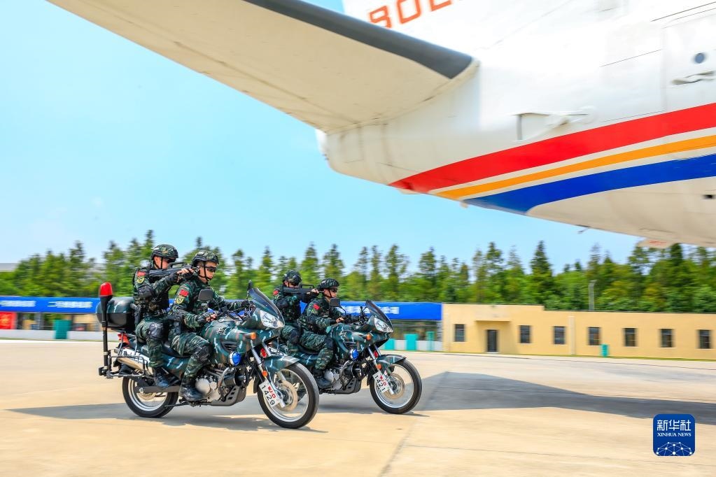 武警上??傟牂C動第一支隊特戰(zhàn)某中隊組織交通工具反劫持綜合演練,特戰(zhàn)隊員乘坐摩托車接近“被劫持飛機”(2022年8月1日攝)。新華社發(fā)(李巖攝)