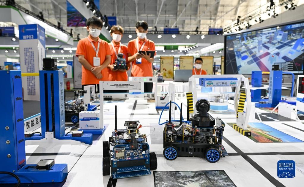 在天津舉行的世界職業(yè)技術(shù)教育發(fā)展大會首屆世界職業(yè)院校技能大賽上,參賽選手在實訓(xùn)沙盤前操作機器人設(shè)備(2022年8月20日攝)。新華社記者 孫凡越 攝