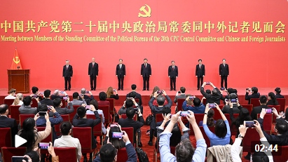 在中國(guó)共產(chǎn)黨第二十屆中央委員會(huì)第一次全體會(huì)議上當(dāng)選的中共中央總書記習(xí)近平和中共中央政治局常委李強(qiáng)、趙樂際、王滬寧、蔡奇、丁薛祥、李希,23日中午在人民大會(huì)堂同采訪中共二十大的中外記者親切見面。