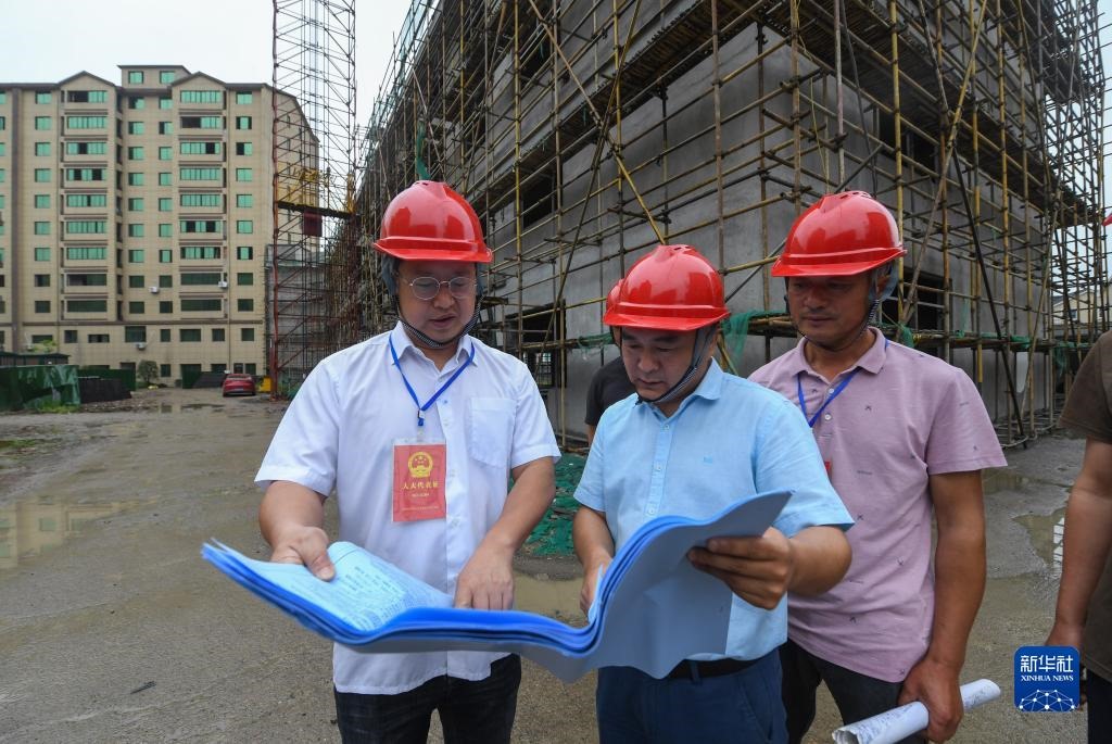 在浙江省湖州市吳興區(qū)東林鎮(zhèn)星火村,當(dāng)?shù)厝舜蟠砑按迕翊韺π腔鸫遛r(nóng)民新村建設(shè)項(xiàng)目的施工進(jìn)展情況進(jìn)行監(jiān)督檢查(2021年6月2日攝)。新華社記者 徐昱 攝
