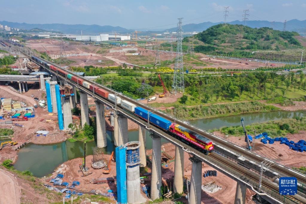中緬新通道(重慶—臨滄—緬甸)國際鐵路班列從重慶果園港魚嘴車站順利發(fā)車(5月23日攝,無人機(jī)照片)。新華社記者 唐奕 攝