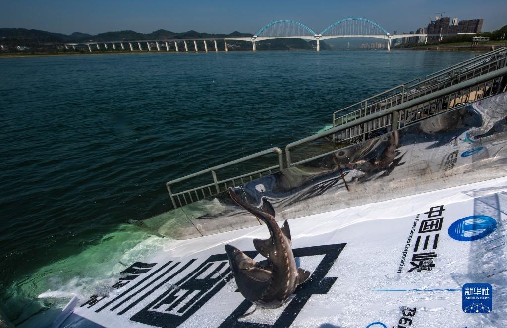 在湖北省宜昌市舉行的“2022年長江三峽中華鱘放流活動”現(xiàn)場,中華鱘從放流通道滑入長江(4月9日攝)。新華社發(fā)(鄭家裕 攝)