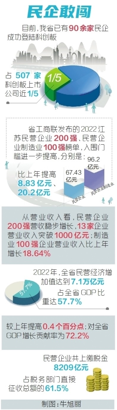 勇立實(shí)業(yè)潮頭,爭(zhēng)當(dāng)奮楫搏浪的“水手”,另一份榜單同樣能佐證江蘇民企的勇毅前行。去年9月,省工商聯(lián)發(fā)布2022江蘇民營企業(yè)200強(qiáng)、民營企業(yè)制造業(yè)100強(qiáng)榜單,入圍門檻進(jìn)一步提高,分別達(dá)67.43億元、96.2億元,比上年提高8.83億元、20.2億元。從營業(yè)收入看,民營企業(yè)200強(qiáng)營收穩(wěn)步增長,13家企業(yè)營業(yè)收入突破1000億元;制造業(yè)100強(qiáng)企業(yè)營業(yè)收入比上年增長18.64%。