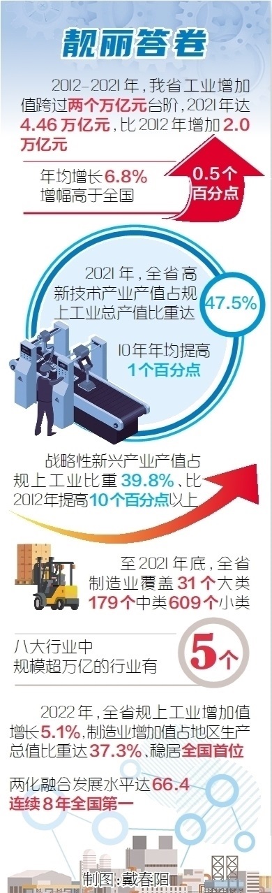 制造業(yè)規(guī)模實(shí)力保持領(lǐng)先。我省把制造業(yè)高質(zhì)量發(fā)展擺在更加突出位置,加快傳統(tǒng)產(chǎn)業(yè)轉(zhuǎn)型和戰(zhàn)略性新興產(chǎn)業(yè)發(fā)展,推進(jìn)產(chǎn)業(yè)邁向中高端水平。工業(yè)增加值10年跨過3萬億、4萬億兩個(gè)臺(tái)階,2021年達(dá)4.46萬億元,比2012年增加2.0萬億元,年均增長(zhǎng)6.8%,增幅高于全國0.5個(gè)百分點(diǎn)。