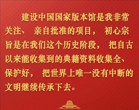 習(xí)近平強(qiáng)調(diào),建設(shè)中國國家版本館,是文明大國建設(shè)的基礎(chǔ)工程,是功在當(dāng)代、利在千秋的標(biāo)志性文化工程。