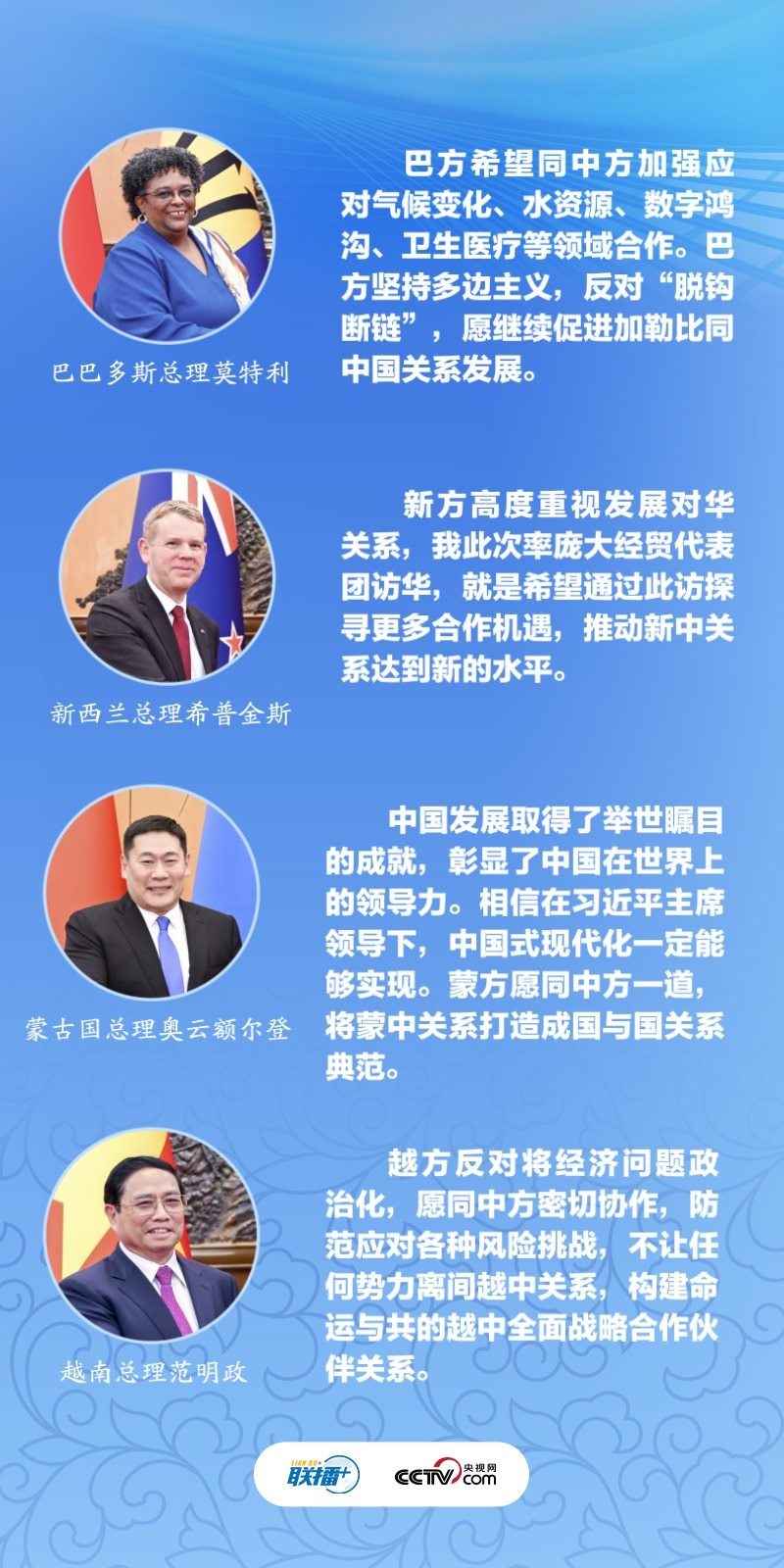 當(dāng)天,“命運共同體”一詞在習(xí)近平主席的講話中高頻出現(xiàn)。會見巴巴多斯總理時,他歡迎巴方搭乘中國發(fā)展“快車”,同中方構(gòu)建更緊密中巴命運共同體;會見蒙古國總理時,他提出“以構(gòu)建中蒙命運共同體為引領(lǐng),不斷深化兩國友好、互信、合作”;會見越南總理時,他直言“中方視越方為周邊外交的優(yōu)先方向和具有戰(zhàn)略意義的命運共同體”……致力于構(gòu)建人類命運共同體,在雙邊層面,習(xí)近平主席與不同國家的領(lǐng)導(dǎo)人深入溝通,推動中國同各有關(guān)國家構(gòu)建命運共同體。