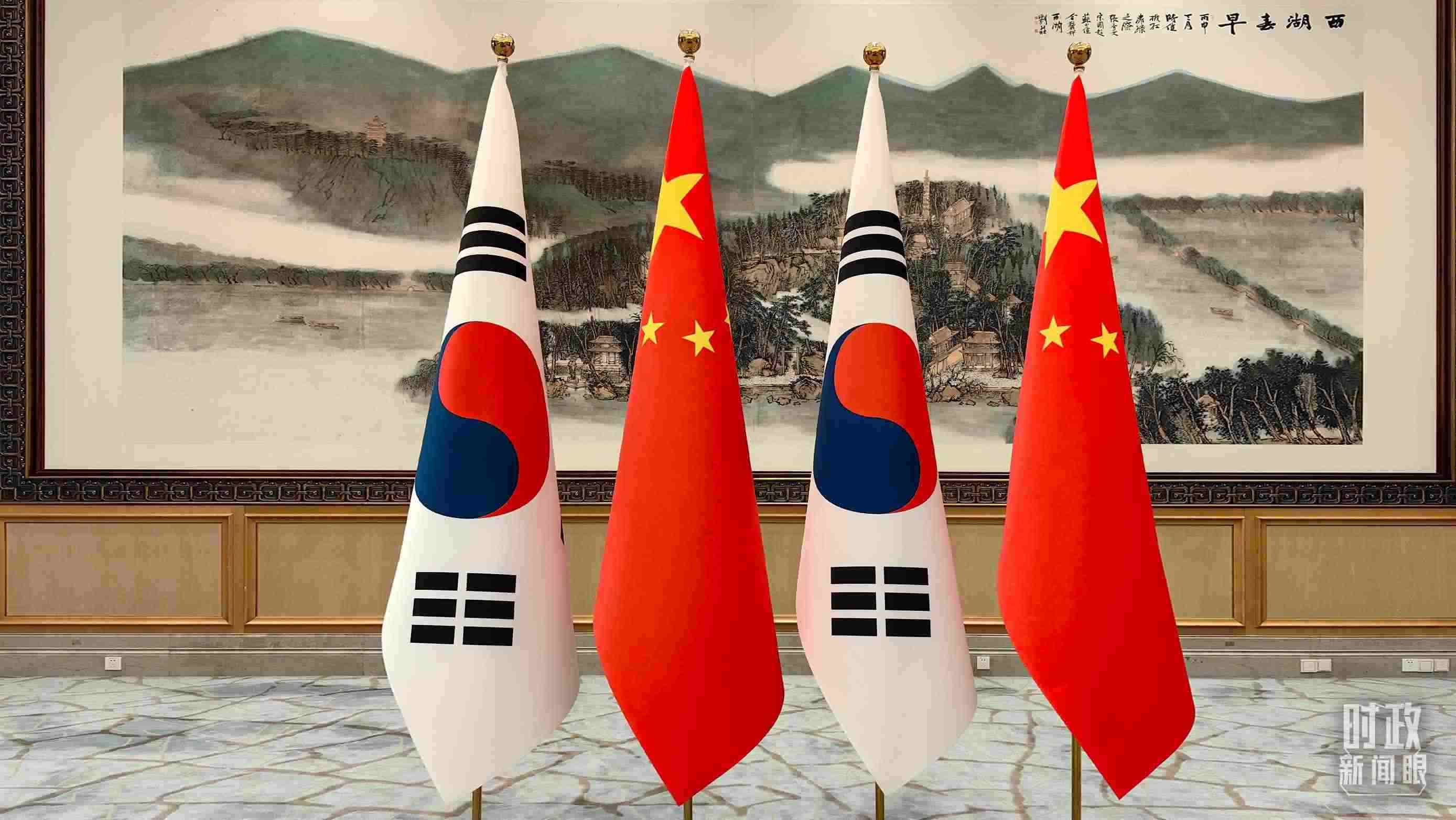 △會(huì)見(jiàn)現(xiàn)場(chǎng)擺放的中國(guó)、韓國(guó)國(guó)旗。(總臺(tái)央廣記者潘毅拍攝)