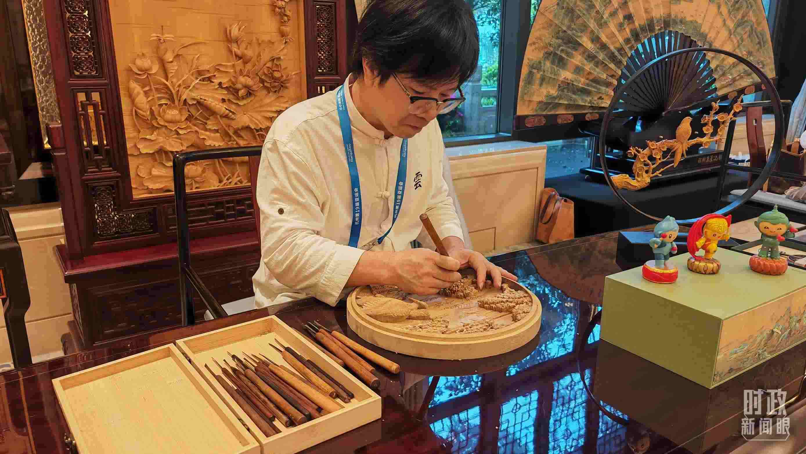 宴會(huì)廳外,東陽(yáng)木雕、杭州刺繡、王星記扇等浙江非物質(zhì)文化遺產(chǎn)展示,吸引貴賓們流連駐足。
