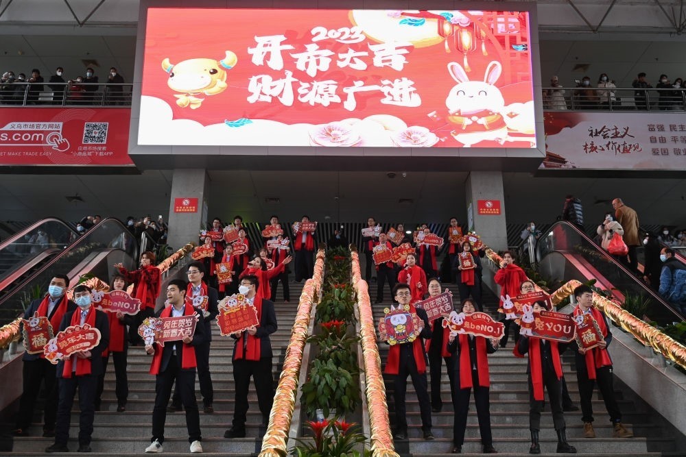 商戶代表在義烏國際商貿(mào)城的大廳進(jìn)行文藝表演(2023年2月2日攝)。新華社記者 黃宗治 攝