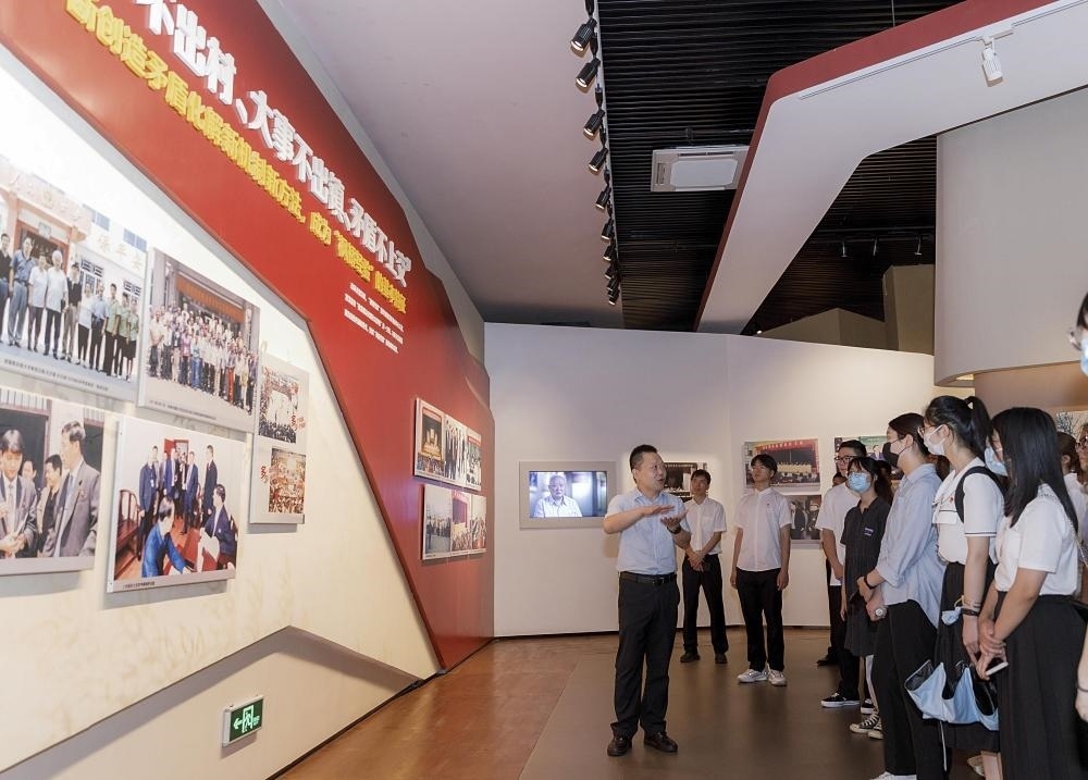 青年學(xué)子在浙江省諸暨市楓橋鎮(zhèn)的楓橋經(jīng)驗陳列館參觀學(xué)習(xí)(2022年8月25日攝)。新華社記者 徐昱 攝