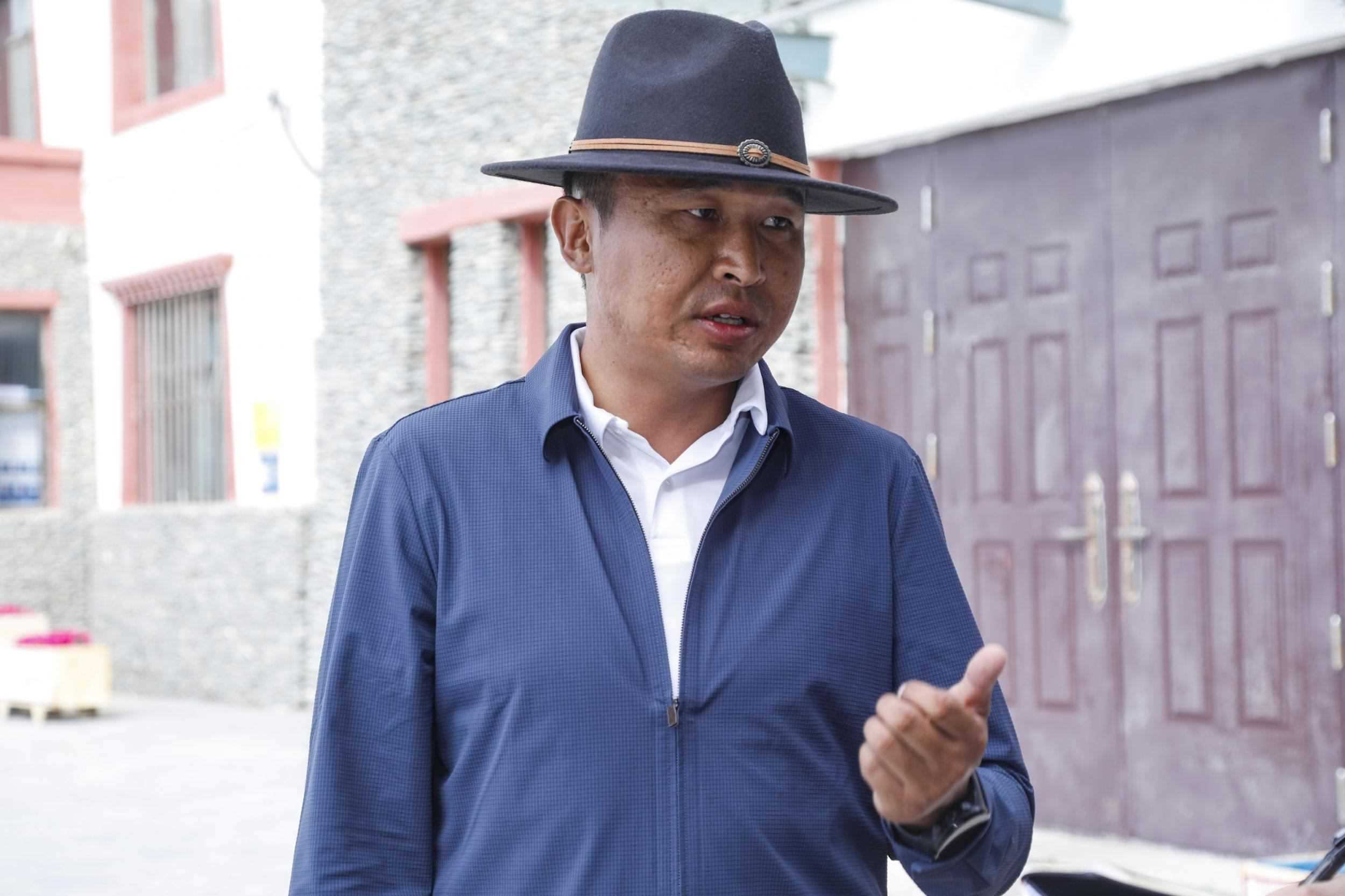 2023年7月22日,在長江源村文化廣場前,唐古拉山鎮(zhèn)黨委書記索南東主分享他參與長江生態(tài)保護(hù)的心得。王箏 攝