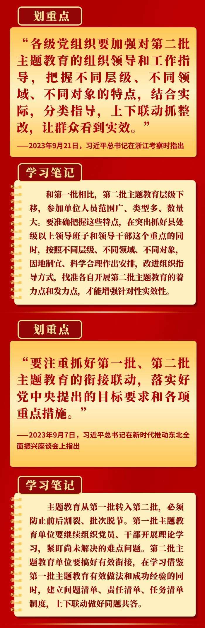 當(dāng)前,第二批學(xué)習(xí)貫徹習(xí)近平新時(shí)代中國特色社會(huì)主義思想主題教育扎實(shí)推進(jìn)。9月以來,習(xí)近平總書記在黑龍江、浙江、江西考察時(shí),對(duì)第二批主題教育工作提出明確要求,為持續(xù)開展好這件“事關(guān)全局的大事”指明方向。一起學(xué)習(xí)。