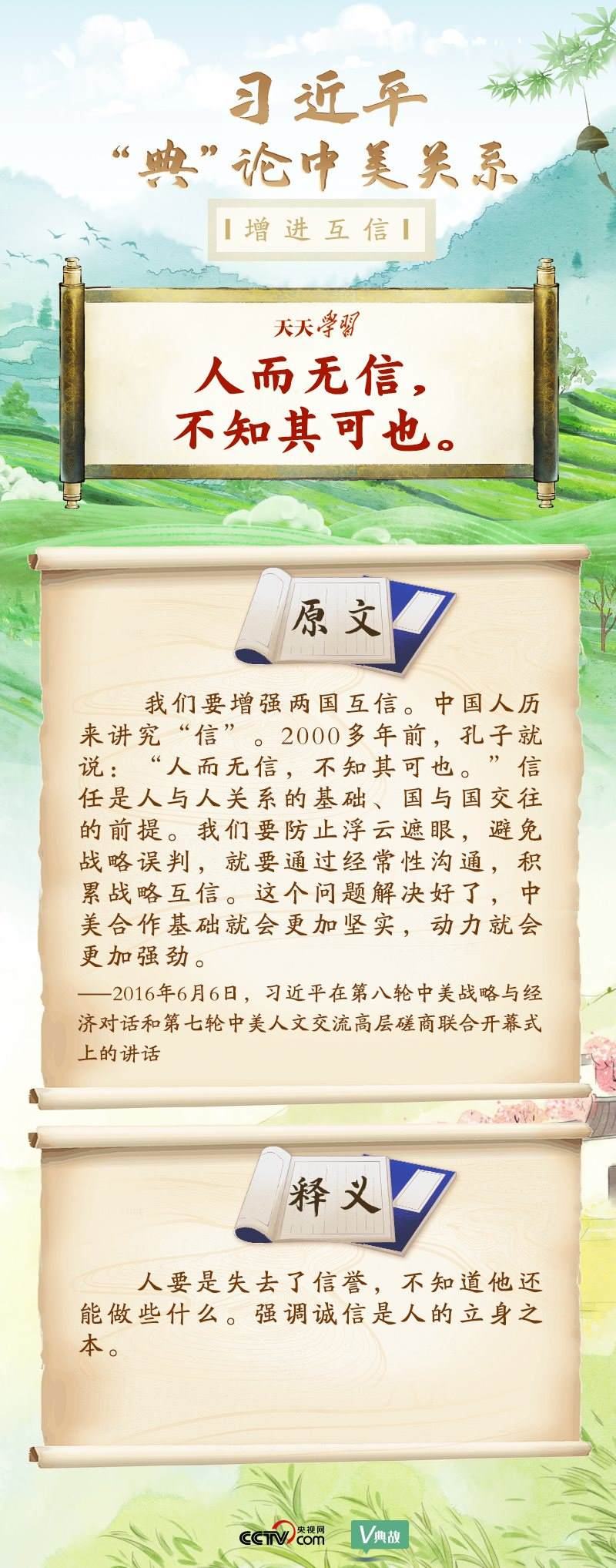 黨的十八大以來,習近平主席就中美關系發(fā)表了一系列重要講話。他站在時代高度分析、研判中美關系現狀及發(fā)展趨勢,并引經據典為發(fā)展中美關系指出正確方向。這些論述蘊含深刻的戰(zhàn)略思維和政治智慧,具有重大現實意義和深遠歷史意義。央視網《天天學習》與您一起深刻領會。