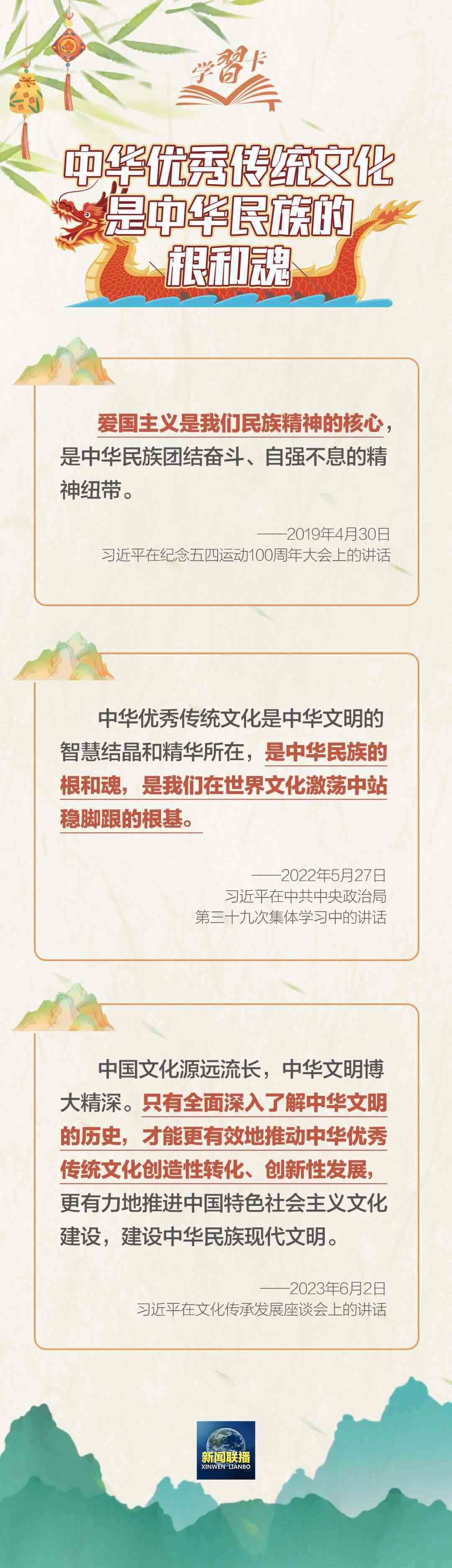 在棹影斡波、鼓聲劈浪中舉行龍舟賽,品嘗軟糯可口的香粽,門上掛艾草和菖蒲……端午節(jié)生動印證了“中華優(yōu)秀傳統(tǒng)文化已經(jīng)成為中華民族的基因”,已成為弘揚民族精神、激發(fā)愛國情感的重要載體。
