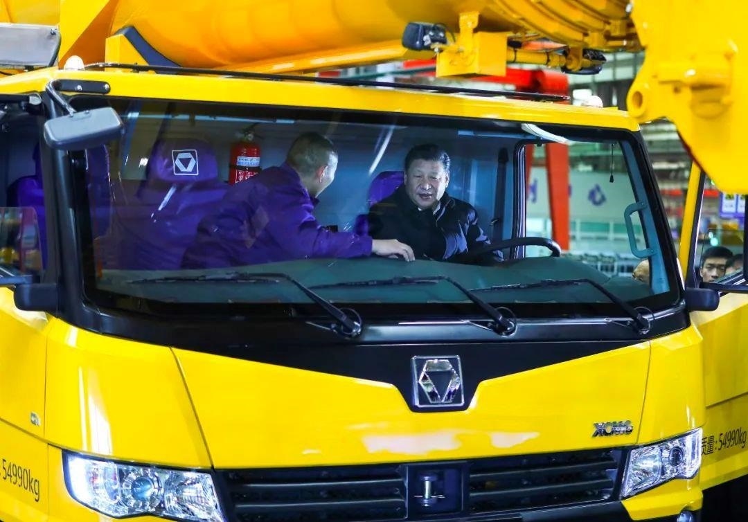△2017年12月12日,習(xí)近平總書(shū)記在江蘇徐州徐工集團(tuán)坐進(jìn)剛下線的XCA220型全地面起重機(jī)駕駛室,向技術(shù)人員詳細(xì)詢問(wèn)起重機(jī)的性能、產(chǎn)量、價(jià)格等。