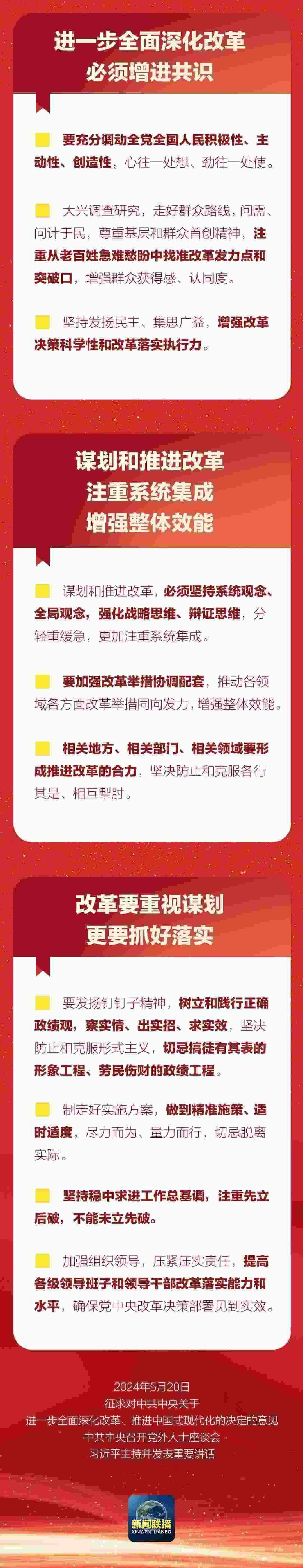 中共中央5月20日在中南海召開(kāi)黨外人士座談會(huì),就中共中央關(guān)于進(jìn)一步全面深化改革、推進(jìn)中國(guó)式現(xiàn)代化的決定聽(tīng)取各民主黨派中央、全國(guó)工商聯(lián)負(fù)責(zé)人和無(wú)黨派人士代表的意見(jiàn)建議。中共中央總書(shū)記習(xí)近平主持座談會(huì)并發(fā)表重要講話。