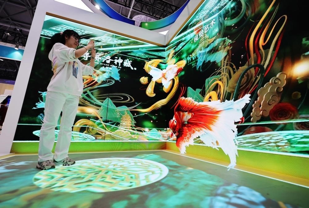 2024年4月1日,在安徽合肥舉辦的2024國(guó)際顯示技術(shù)大會(huì)上,一名觀眾體驗(yàn)京東方展出的裸眼3D快速拆裝折角屏。