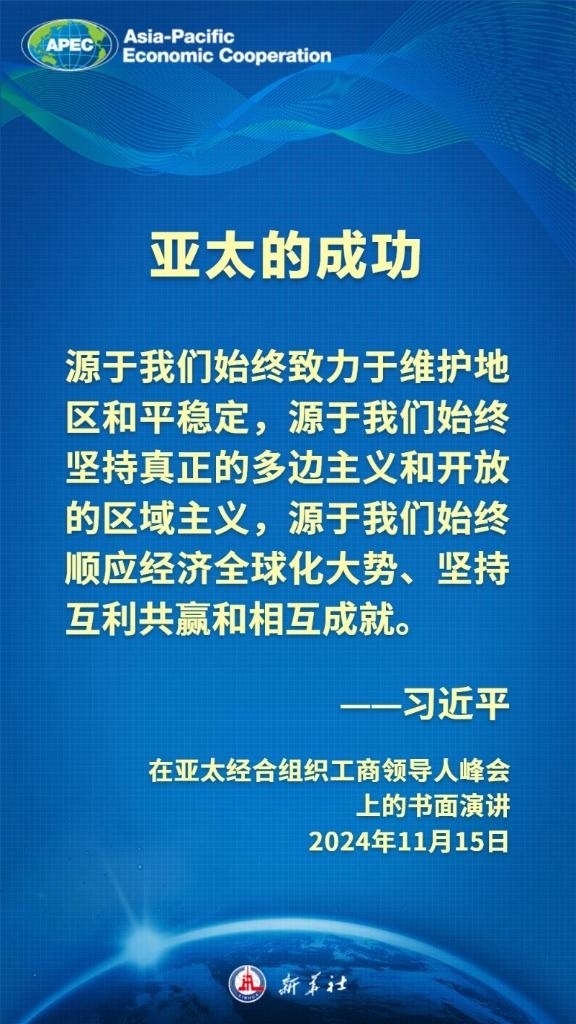 當(dāng)?shù)貢r間11月15日上午,國家主席習(xí)近平向在利馬舉行的亞太經(jīng)合組織工商領(lǐng)導(dǎo)人峰會發(fā)表題為《把握時代大勢 共促世界繁榮》的書面演講,這樣闡述亞太合作——