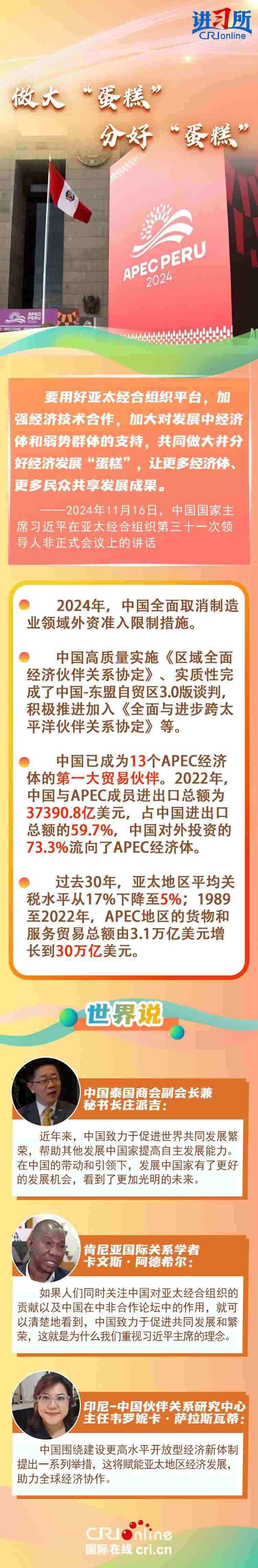 自1991年加入APEC以來,中國作為關鍵一員,持續(xù)為亞太地區(qū)成為世界經(jīng)濟的“火車頭”輸出關鍵穩(wěn)定力量,習近平主席表示,“落其實者思其樹,飲其流者懷其源”。中國的發(fā)展離不開亞太,也將進一步造福亞太。多國人士表示,在中國的帶動和引領下,發(fā)展中國家有了更好的發(fā)展機會,看到了更加光明的未來。