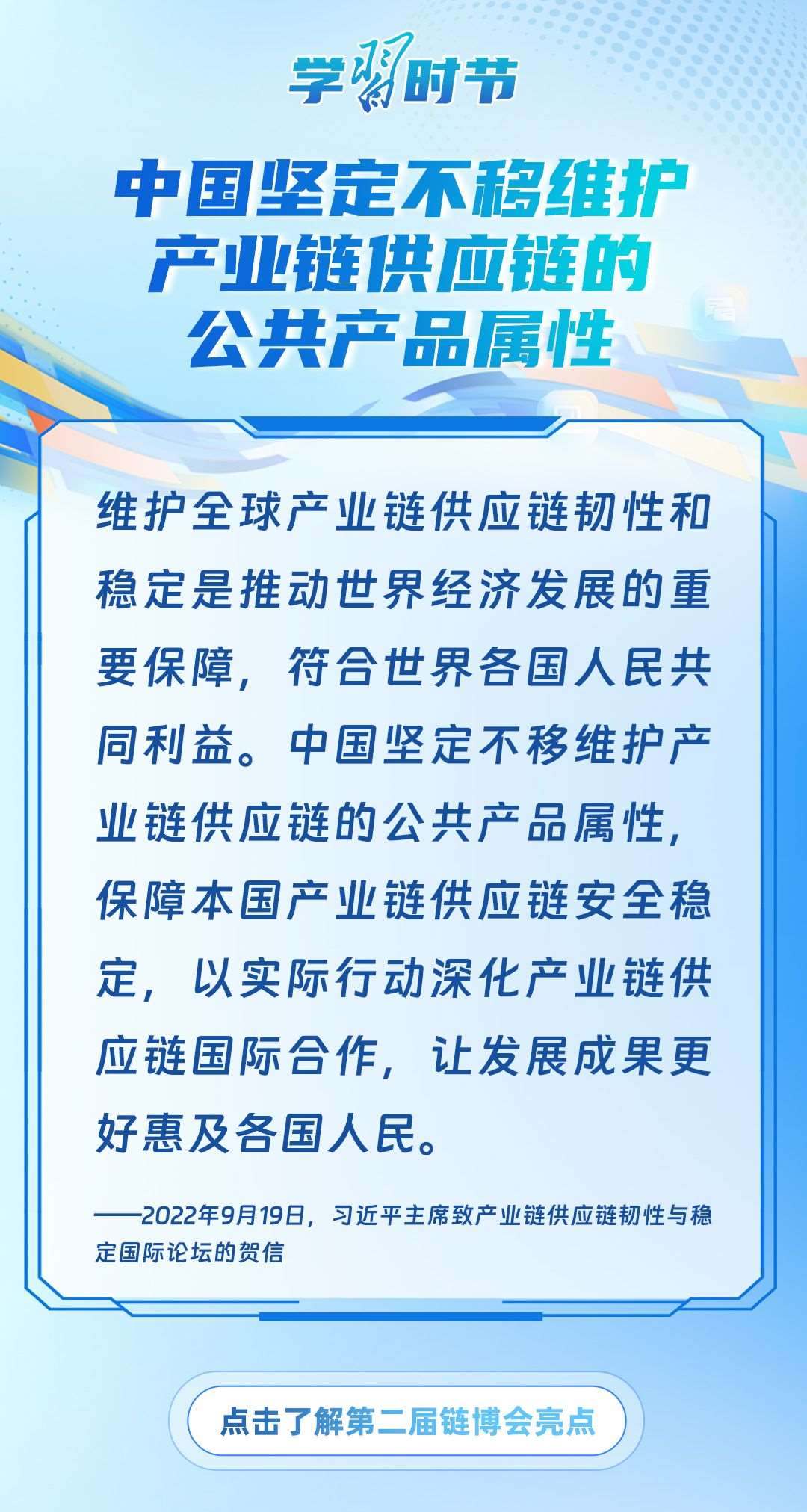 習(xí)近平主席心系產(chǎn)業(yè)鏈供應(yīng)鏈安全穩(wěn)定,多次強(qiáng)調(diào)中國(guó)將以實(shí)際行動(dòng)維護(hù)全球產(chǎn)業(yè)鏈供應(yīng)鏈安全穩(wěn)定,為世界各國(guó)共同構(gòu)筑安全穩(wěn)定、暢通高效、開放包容、互利共贏的全球產(chǎn)業(yè)鏈供應(yīng)鏈體系提供中國(guó)方案。習(xí)近平主席曾在多個(gè)重要場(chǎng)合對(duì)此作出一系列深刻闡述,讓我們一起學(xué)習(xí)。