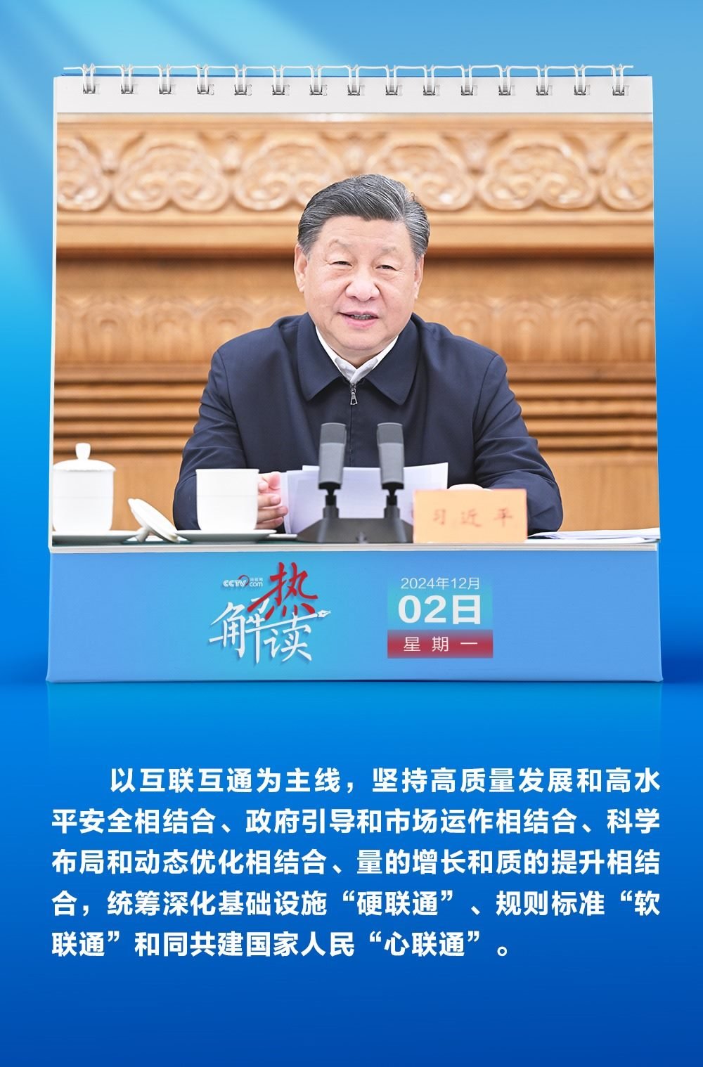 “統(tǒng)籌深化基礎設施‘硬聯(lián)通’、規(guī)則標準‘軟聯(lián)通’和同共建國家人民‘心聯(lián)通’”,“完善‘硬聯(lián)通’、‘軟聯(lián)通’、‘心聯(lián)通’協(xié)調(diào)推進機制”。12月2日,習近平總書記在第四次“一帶一路”建設工作座談會上對深化三個“聯(lián)通”再作部署。