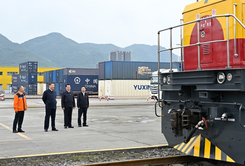 △ 2024年4月22日,習(xí)近平總書記在重慶國際物流樞紐園區(qū)重慶鐵路集裝箱中心站考察。