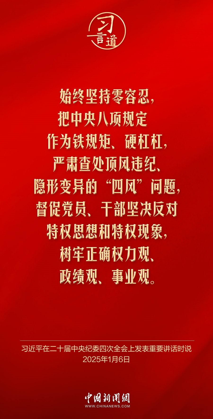 黨中央決定,自2025年全國(guó)兩會(huì)后至7月在全黨開展深入貫徹中央八項(xiàng)規(guī)定精神學(xué)習(xí)教育。黨的作風(fēng)就是黨的形象,關(guān)系人心向背,決定黨和國(guó)家事業(yè)成敗。習(xí)近平總書記高度重視作風(fēng)建設(shè),就貫徹落實(shí)中央八項(xiàng)規(guī)定精神、深化作風(fēng)建設(shè)作出一系列重要論述——