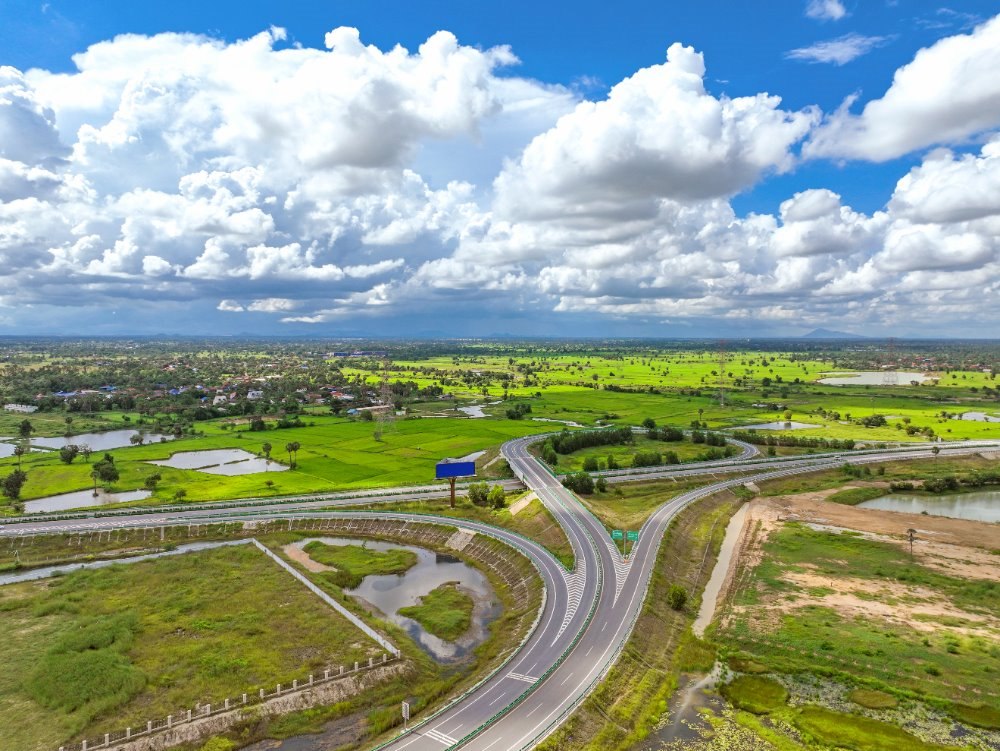 這是2024年9月25日在柬埔寨磅士卑省拍攝的金港高速公路(無人機照片)。金港高速公路是中國路橋工程有限責任公司(中國路橋)按“建造-運營-移交”模式投資的項目。新華社發(fā)(柬埔寨金港高速公路有限公司供圖)