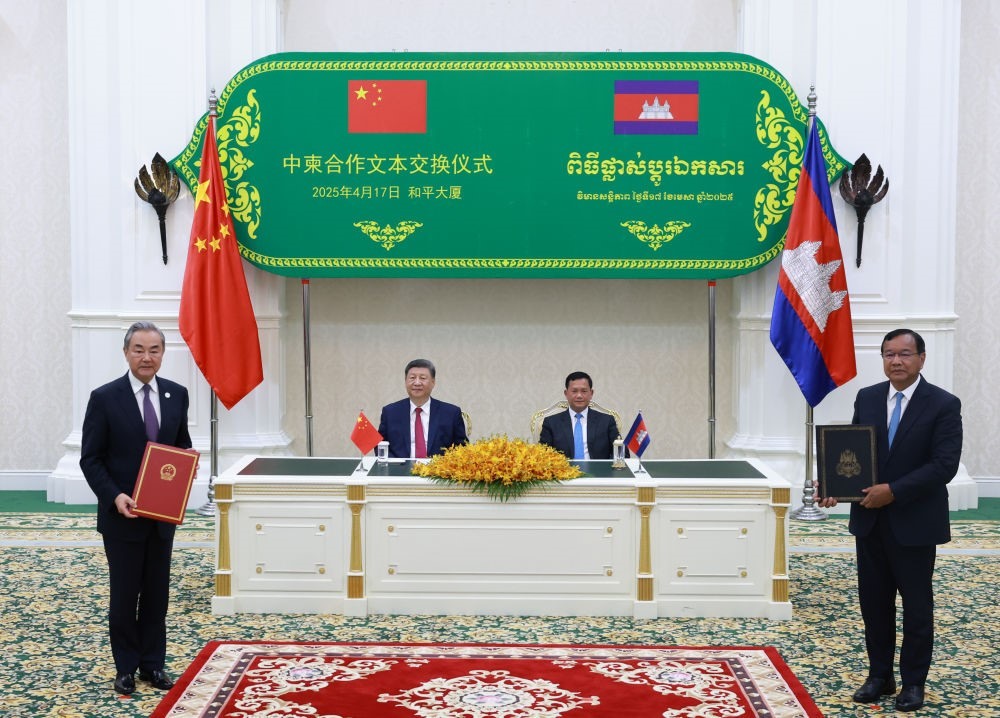 4月17日晚,國(guó)家主席習(xí)近平同柬埔寨首相洪瑪奈在金邊和平大廈舉行會(huì)談。這是會(huì)談后,兩國(guó)領(lǐng)導(dǎo)人共同見(jiàn)證中柬雙方交換雙邊合作文本。新華社記者 王曄 攝