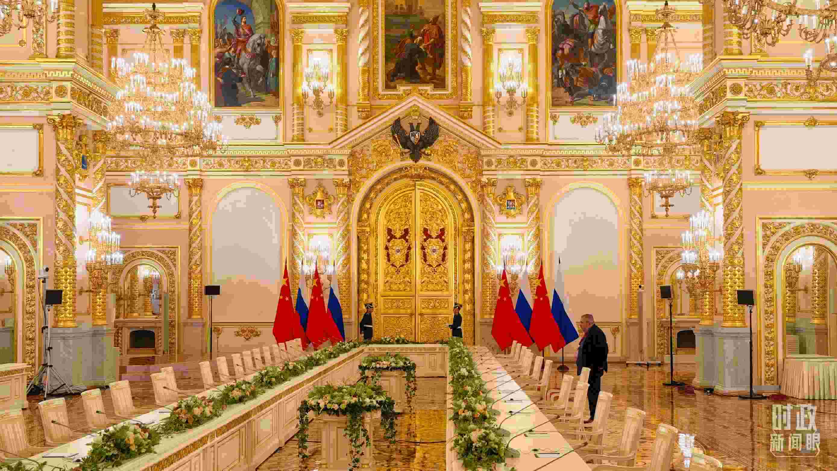 8日上午,在克里姆林宮二層的喬治大廳,普京總統(tǒng)為習主席舉行隆重歡迎儀式。兩國元首從兩側(cè)沿紅地毯健步走入大廳中央,親切握手合影。2019年、2023年習主席對俄羅斯進行國事訪問時,普京總統(tǒng)也是在這里為習主席舉行隆重歡迎儀式。