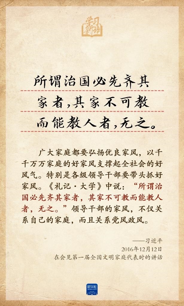 家風(fēng)是社會(huì)風(fēng)氣的重要組成部分。習(xí)近平總書記始終重視家庭、家教、家風(fēng)建設(shè),多次在重要場合引經(jīng)據(jù)典話家風(fēng)。5月15日是國際家庭日,我們選取總書記相關(guān)重要論述,品讀其中深意。