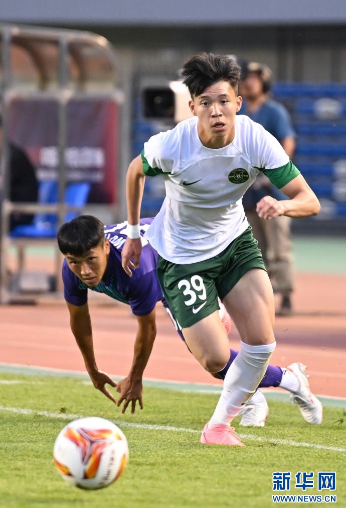 ??6月15日,浙江俱樂部U21隊球員王鈺棟(前)在比賽中帶球突破。