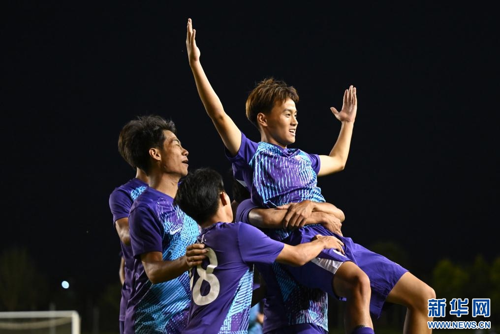 ??6月15日,天津津門虎U21隊球員王忠民(右一)在比賽中與隊友慶祝進(jìn)球。