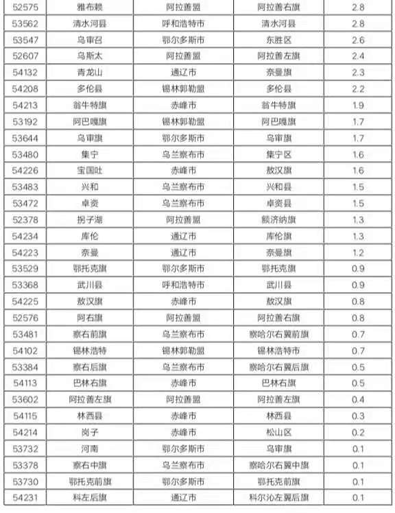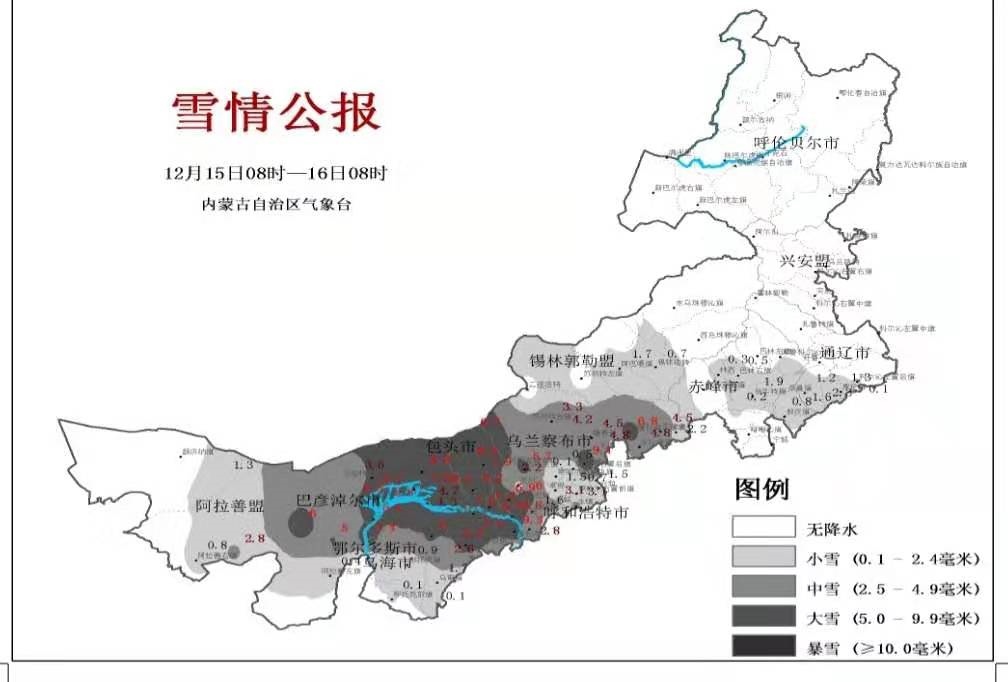中雪:15個旗縣共16個站出現(xiàn)中雪,其中,鄂爾多斯市杭錦旗伊克烏素4.9毫米、錫林郭勒盟太仆寺旗4.8毫米、烏蘭察布市化德縣4.8毫米。