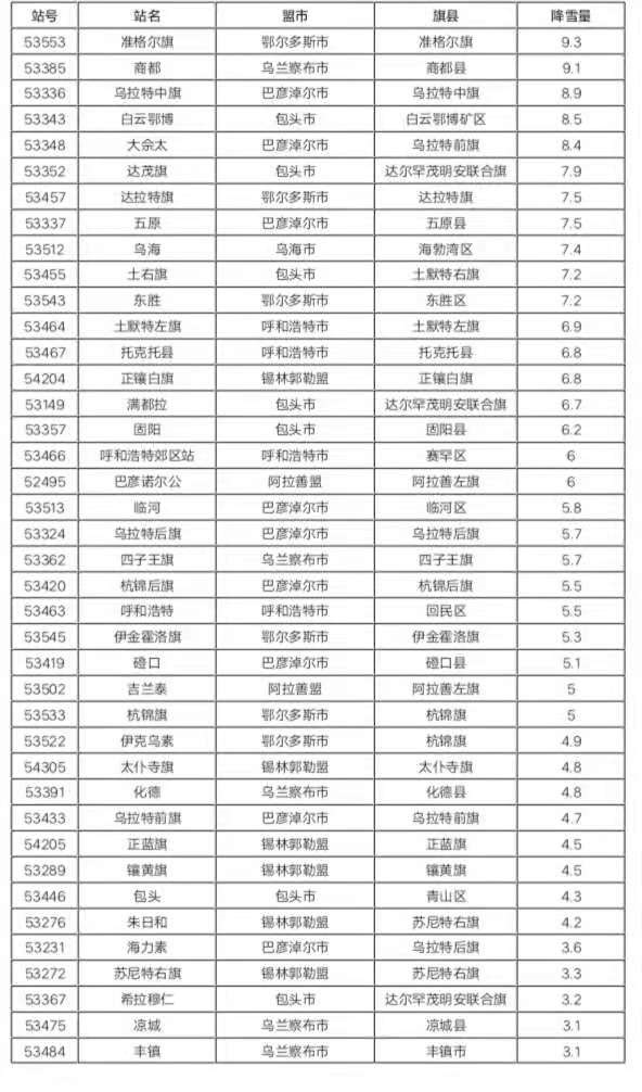 大雪:25個旗縣共27個站出現(xiàn)大雪,其中,鄂爾多斯市準(zhǔn)格爾旗9.3毫米、烏蘭察布市商都縣9.1毫米、巴彥淖爾市烏拉特中旗8.9毫米。
