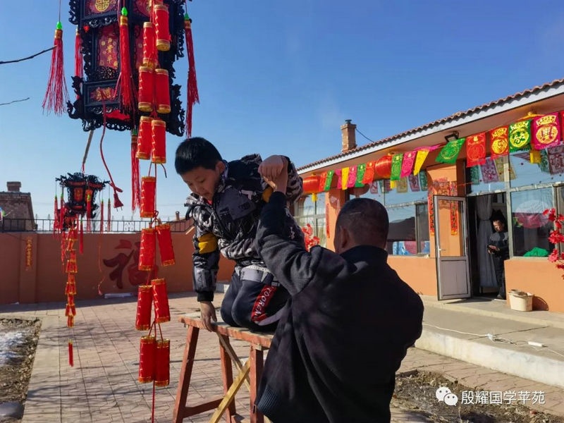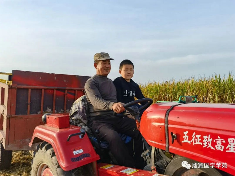 父親讓曈曈接地氣的愿望實現了,長得越來越壯實的曈曈真是打心眼喜歡上了農村,喜歡看叔叔大爺們是如何勞動的。春天澆地的時候,他跟上我的發(fā)小利利到地里去,手里拿上一張鐵鍬學著去攏堰堤;秋收的時候他爬上了丁補元駕駛的收割機,感受農民們收割玉米的喜悅;接羔的時候,他又鉆進利軍家的羊群里,抱著出生沒有幾天的小羊羔,給小羊羔喂牛奶……春節(jié)前的一兩天是他最忙的時候:一會跟上大爹貼春聯,一會跟上茹義大爺掛紅燈,忙得不亦樂乎。前一段時間回村里他又要跟上利軍大爺出村放羊去,又要跟上茹義大爺去種玉米,在城里他是見識不到這些的。