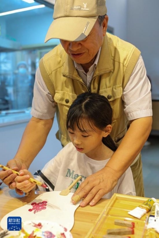 9月24日,在婁塘塌餅非遺傳承館,外國(guó)小朋友體驗(yàn)畫扇面。