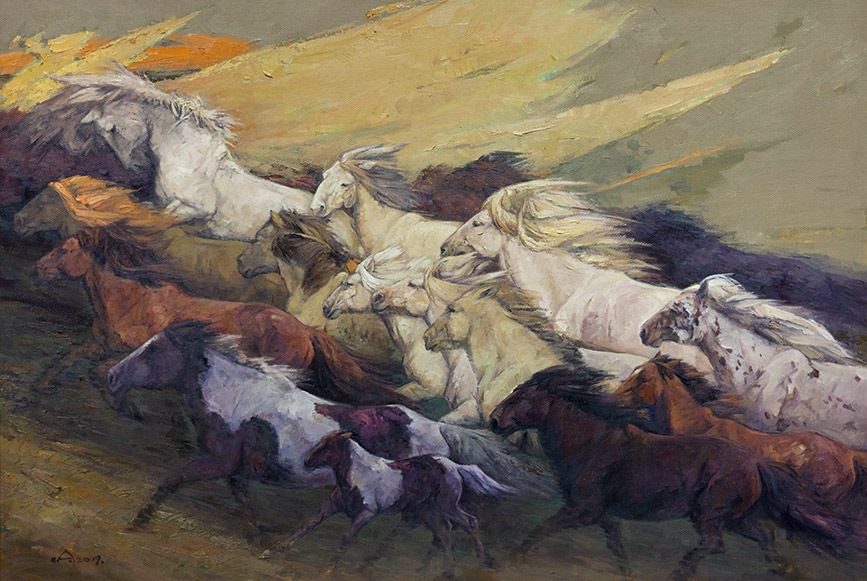哈日巴拉油畫(huà)《逐夢(mèng)前行蒙古馬》