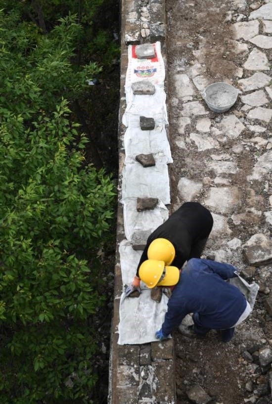 在箭扣長城122號敵臺東側墻體,工人給剛剛砌好的磚蓋上編織袋遮雨(7月2日攝)。新華社記者 陳鐘昊 攝