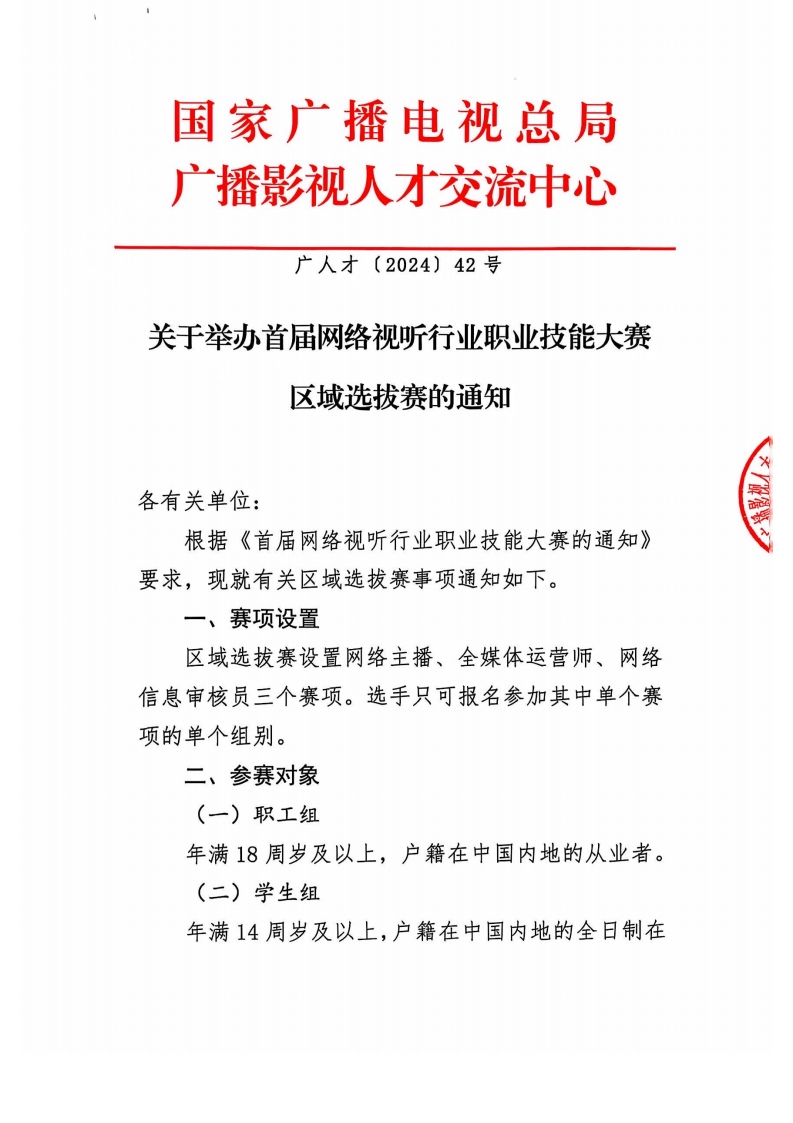 本次技能大賽報名時間從即日起至2024年11月17日17:00,相關(guān)報名通道和競賽規(guī)則等具體內(nèi)容,請登錄國家廣電人才網(wǎng)(nrtatalent.cn)“首屆網(wǎng)絡(luò)視聽行業(yè)職業(yè)技能大賽”專區(qū)(http://ds.nrtatalent.cn)自行查看。