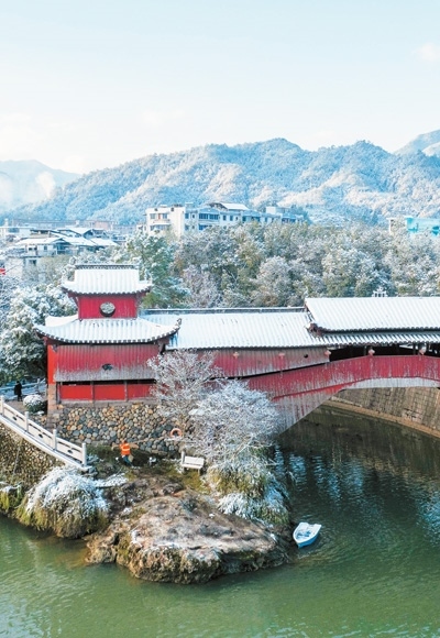 位于浙江省麗水市慶元縣的古廊橋詠歸橋雪后景色。