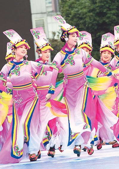 在四川省北川羌族自治縣新生廣場,羌族學(xué)生跳沙朗舞歡慶羌歷新年。