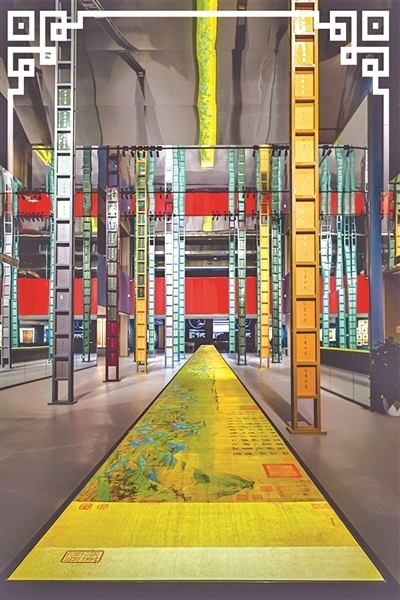走進展廳,墨綠色、宮墻紅、灰藍色不一的墻面上,懸掛著用淺色木框裝裱的繪畫展品,素淡清雅,古韻悠然。展廳中間,《千里江山圖》高清打樣稿鋪展開來,如同一條流淌的青綠長河。放大兩倍后,畫中各種各樣的漁舟、山石的皴法依然清晰可辨。