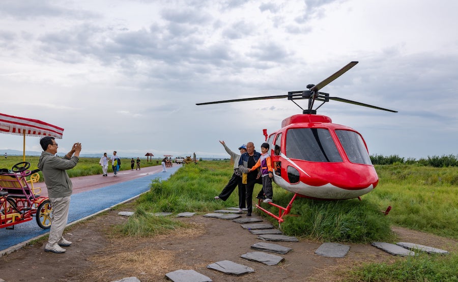 來自全國各地的游客踏過浸潤雨水的青草,在這片土地上尋覓多樣樂趣:身著盛裝的游客倚著氈房淺笑,鏡頭將服飾的明艷與草原的蒼綠定格成畫;射箭場上,游客拉弓瞄準的瞬間,風聲與周遭歡呼交織成趣;草原觀光小火車緩緩穿行,濕潤的空氣里滿是草木的清新……
