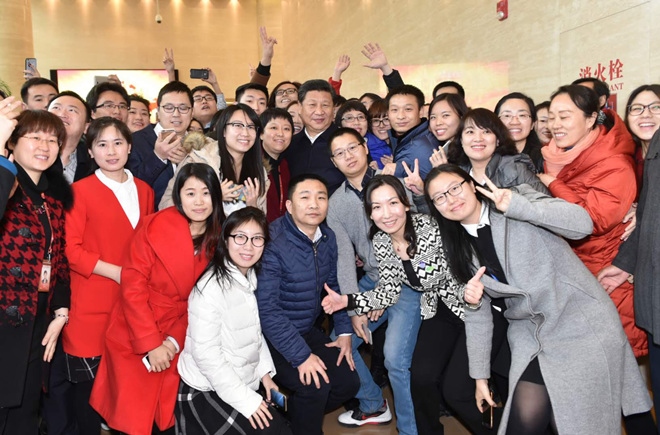 2016年2月19日,習(xí)近平到中央新聞單位調(diào)研。圖為習(xí)近平與人民日報社人民網(wǎng)員工合影。