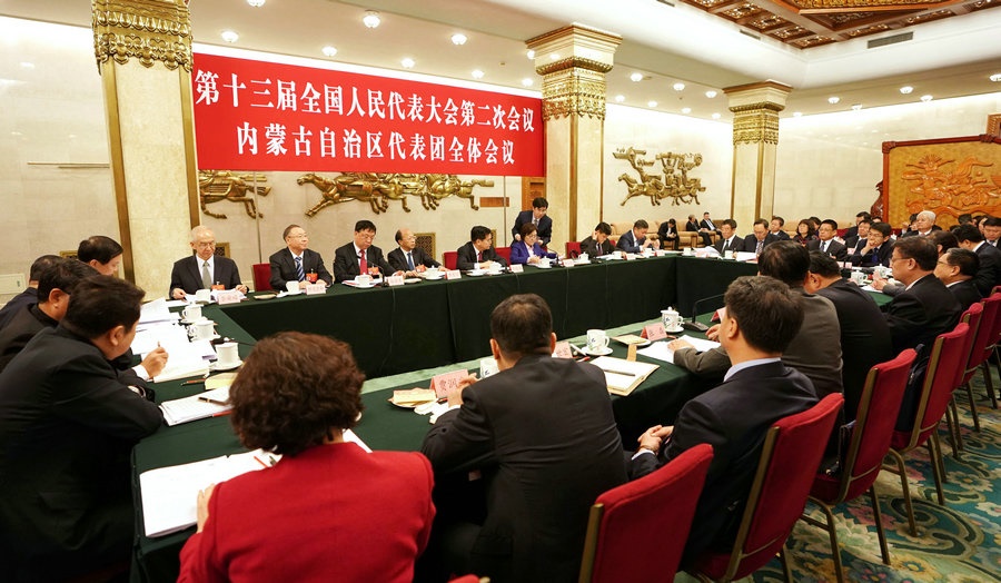 3月6日下午,十三屆全國(guó)人大二次會(huì)議內(nèi)蒙古代表團(tuán)在人民大會(huì)堂內(nèi)蒙古廳舉行全團(tuán)會(huì)議,繼續(xù)審議政府工作報(bào)告。本次全團(tuán)會(huì)議向境內(nèi)外媒體開放。