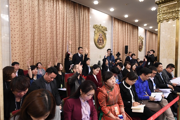 3月6日下午,十三屆全國(guó)人大二次會(huì)議內(nèi)蒙古代表團(tuán)舉行全團(tuán)會(huì)議,審議政府工作報(bào)告并向境內(nèi)外媒體開放。來自17個(gè)國(guó)家和地區(qū)的78家媒體、90名記者到場(chǎng)采訪。內(nèi)蒙古日?qǐng)?bào)社融媒體記者 袁永紅 攝