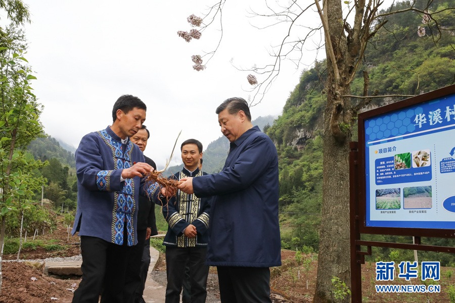 這是4月15日下午,習(xí)近平在石柱土家族自治縣中益鄉(xiāng)華溪村了解該村通過種植中藥材黃精等特色經(jīng)濟(jì)作物帶動村民脫貧的情況。 新華社記者 鞠鵬 攝