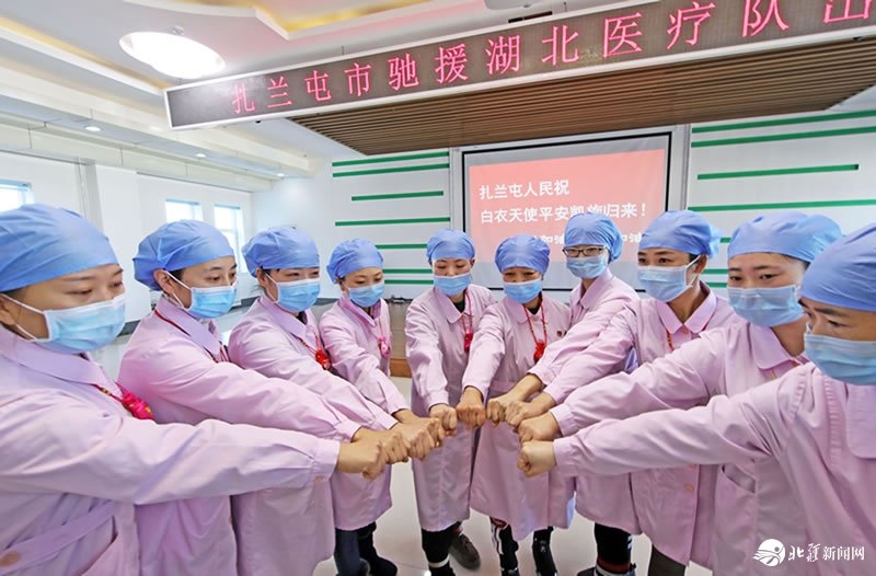 根據(jù)疫情防治需要,呼倫貝爾扎蘭屯市中蒙醫(yī)院醫(yī)療隊的10名護士馳援湖北。2月17日,護士們在出發(fā)前互相加油鼓勁,帶著責任,帶著祝愿,向湖北出發(fā)。(通訊員:韓冷)