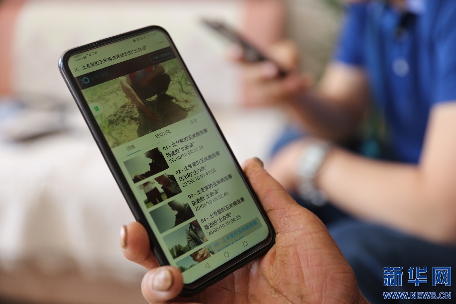 6月10日,內(nèi)蒙古自治區(qū)烏審旗無(wú)定河鎮(zhèn)農(nóng)業(yè)“土專家”在玉米地里針對(duì)小地老虎病蟲害問(wèn)題,進(jìn)行線上直播,向當(dāng)?shù)剞r(nóng)民講解防治方法。新華網(wǎng)曹楨攝